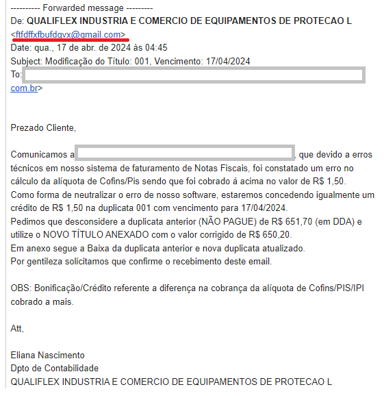 O texto usado pelos golpistas é bastante conhecido e afeta milhares de empresas todos os anos, onde alega-se que houve um erro na emissão da NFe e que seria necessário aplicar um abatimento de impostos.