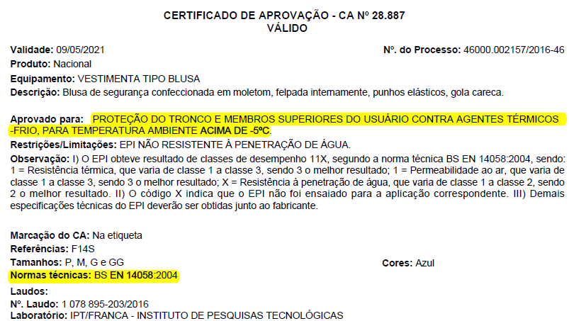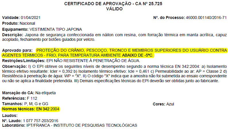 Ø – Conforme verificamos, as vestimentas não expressam seu resultado no CA em “Até quantos graus essa vestimenta suporta”, uma vez que o risco térmico frio é composto por diversas variáveis e não somente a temperatura ambiente, conforme demonstrado acima. A escolha da vestimenta é de responsabilidade do profissional de Segurança do Trabalho em uma análise do ambiente e condições de trabalho.