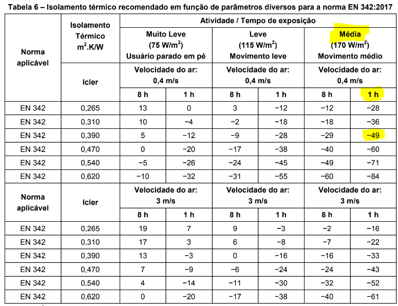 Para interpretar esse resultado, deve-se consultar uma tabela disponível na própria norma, que indica uma determinada temperatura de operação e tempo recomendado de permanência considerando o tipo de atividade/gasto calórico e velocidade do vento.