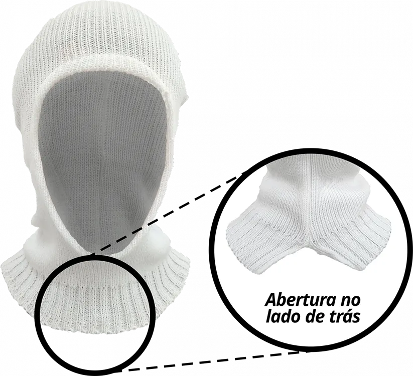 Capuz térmico tricotado em 2 fios de lã acrílica branca, modelo leve com abertura facial. Indicado para proteção contra o frio e queda de cabelos na operação alimentícia.