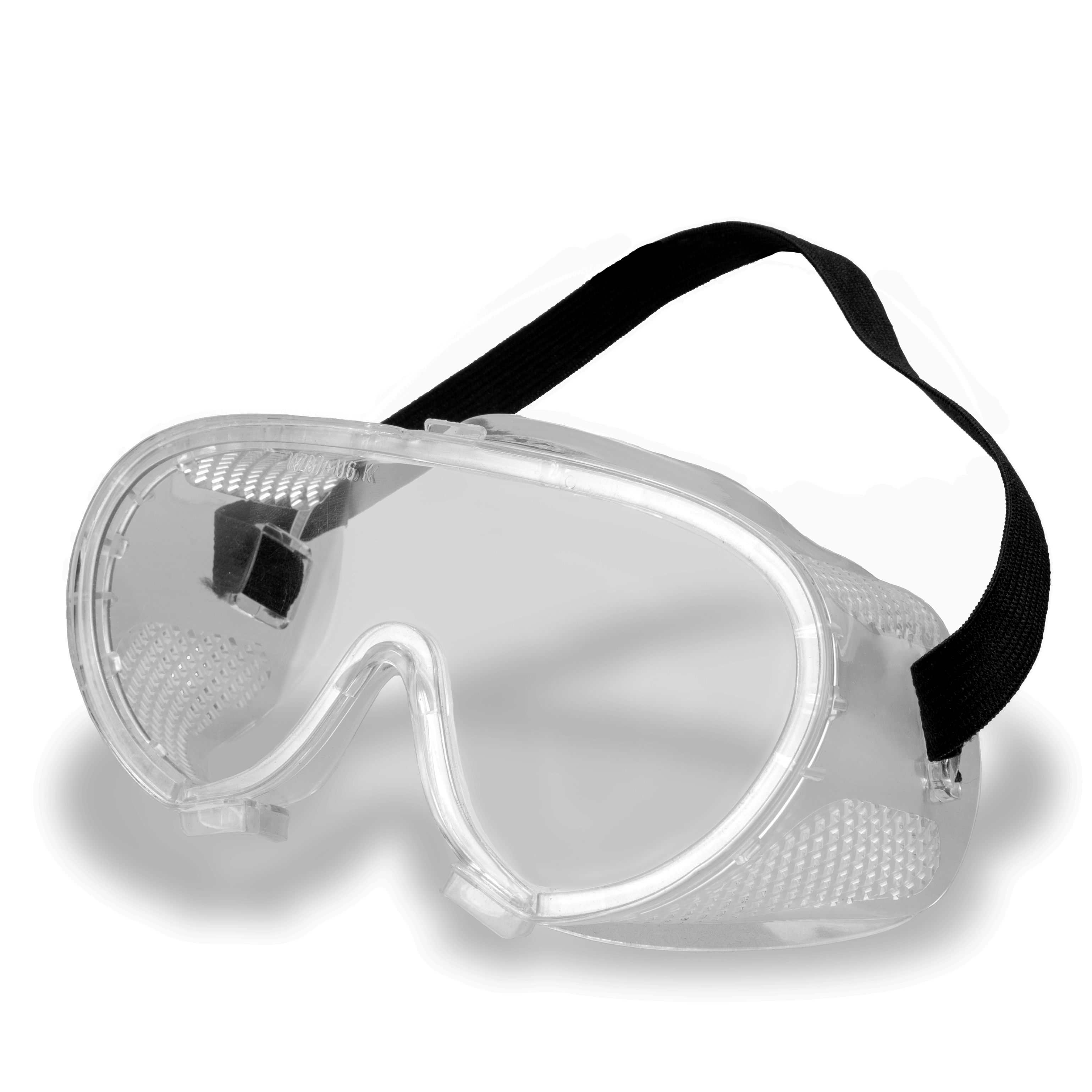 Óculos de proteção, modelo ampla-visão fabricado em policarbonato incolor com tratamento antiembaçante, ajuste através de tira de elástico.