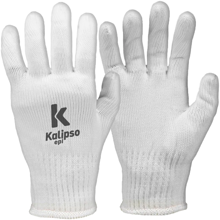 Luva de proteção, tricotada em fio de poliamida, acabamento em overloque, punho com elástico.