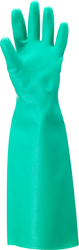 Luva de segurança fabricada com borracha nitrílica premium, grau alimentício, espessura de 0.56 mm, comprimento de 46 cm, sem floco interno de algodão, punho com acabamento “reto” e palma antiderrapante com acabamento tipo “areia”. Modelo Sol-Vex 37-185.