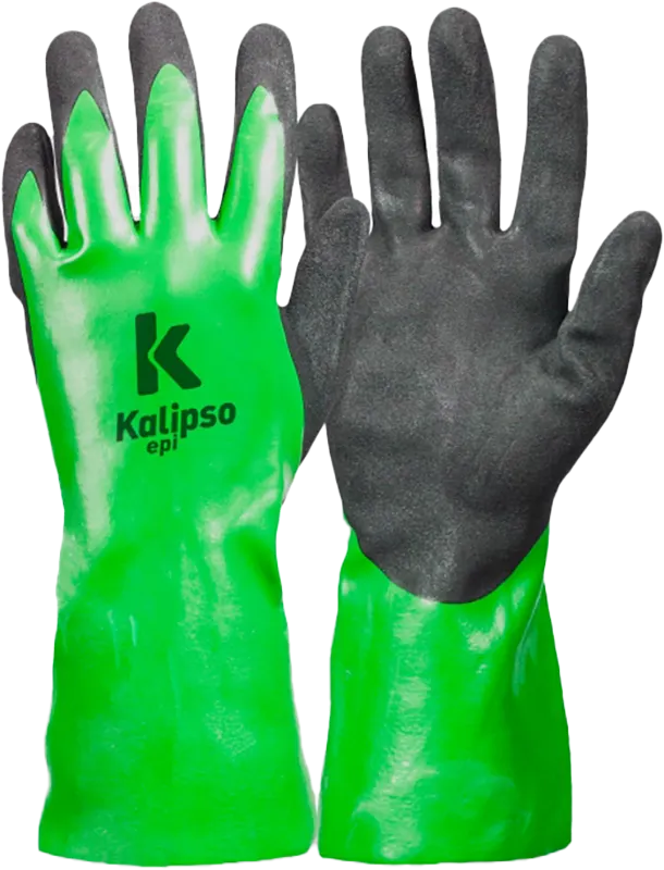 Luva de proteção fabricada com fibras sintéticas combinadas e revestimento total em PVC. Apresenta duplo revestimento complementar em borracha nitrílica tipo Foam, com antiderrapante na palma, face palmar e extremidades dos dedos. Possui acabamento serrilhado no punho.