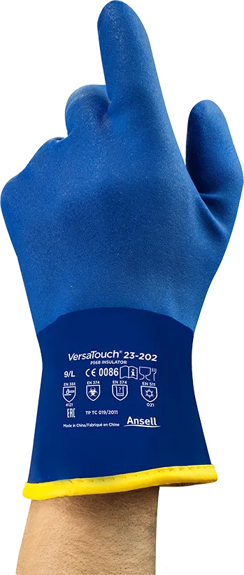 Luva térmica fabricada em PVC super premium Ansell, 100% impermeável, acabamento granulado antiderrapante, forro interno em acrílico polar sem costuras, punho aberto, comprimento de 30cm.