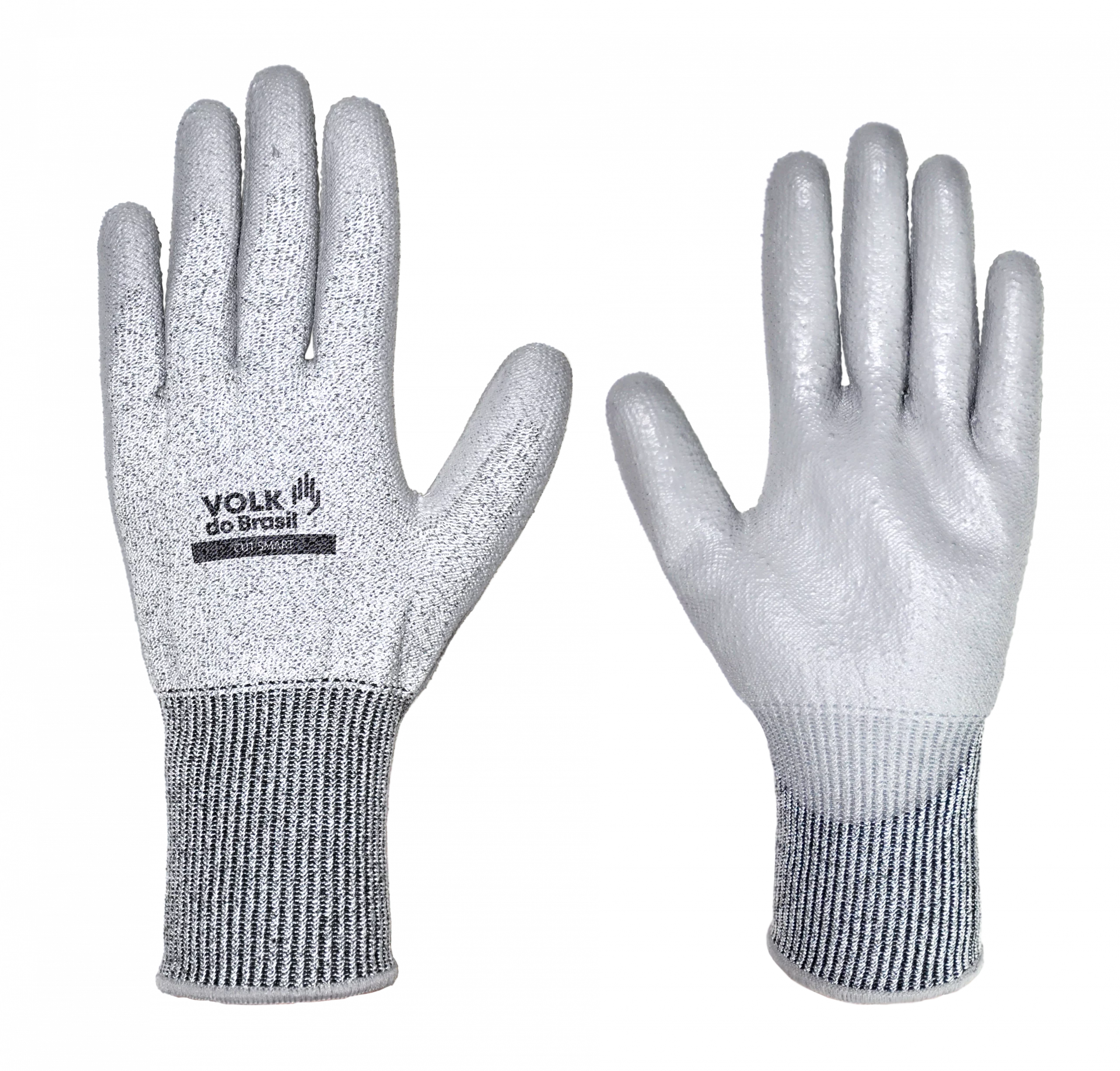 Luva de segurança confeccionadas em fibras sintéticas, fios de aço, fios de HPPE (polietileno de alta performance), revestimento da face palmar e ponta dos dedos em poliuretano (PU), punho com inserções de fibras elásticas e acabamento em fibras sintéticas.