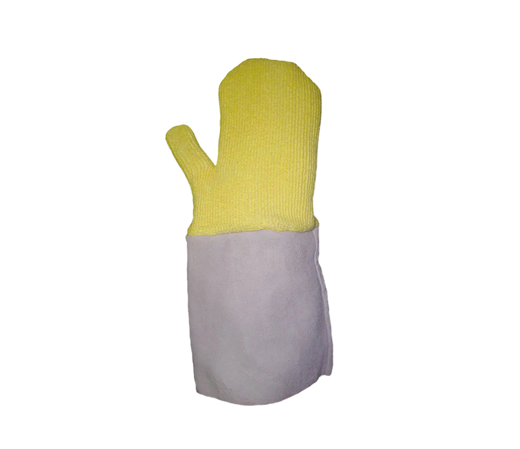 Luva confeccionada em malha de grafatex 100% aramida, forro interno de lã, punho aberto em couro de 20cm – formato “mosha” (mão de gato).