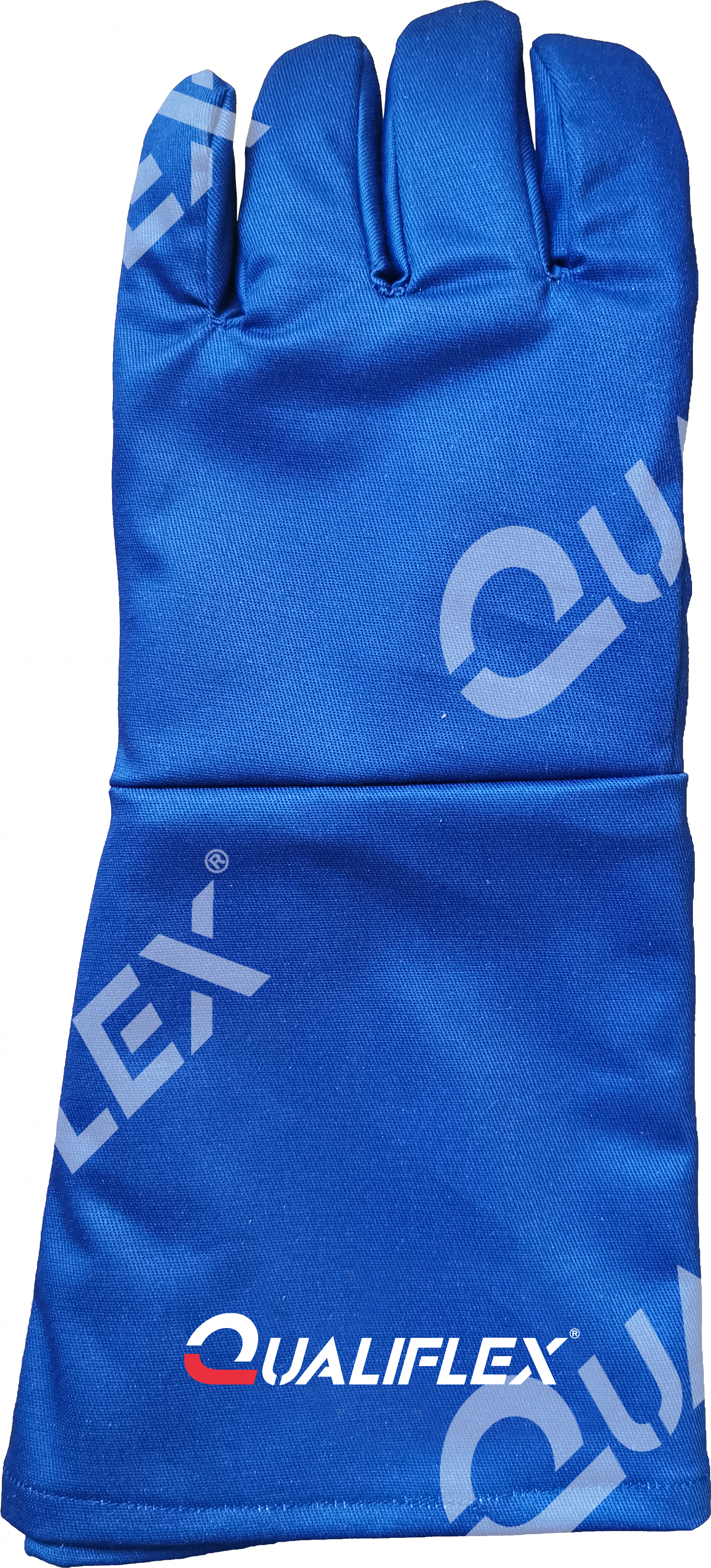 Luva confeccionada em tecido de algodão com tratamento impermeabilizante atóxico e retardante a chamas, forro removível de feltro térmico e brim, costurada com linha de aramida antichamas, comprimento total de 45cm.