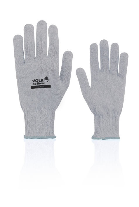 Luva de segurança confeccionada em fios sintéticos, punho com inserções de fibras elásticas e acabamento em fibras sintéticas.