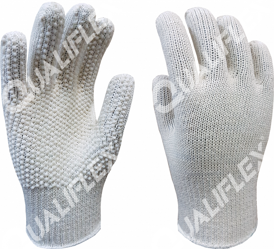 Luva tricotada 6 fios de algodão e poliéster com pigmentação antiderrapante de PVC incolor na face palmar.