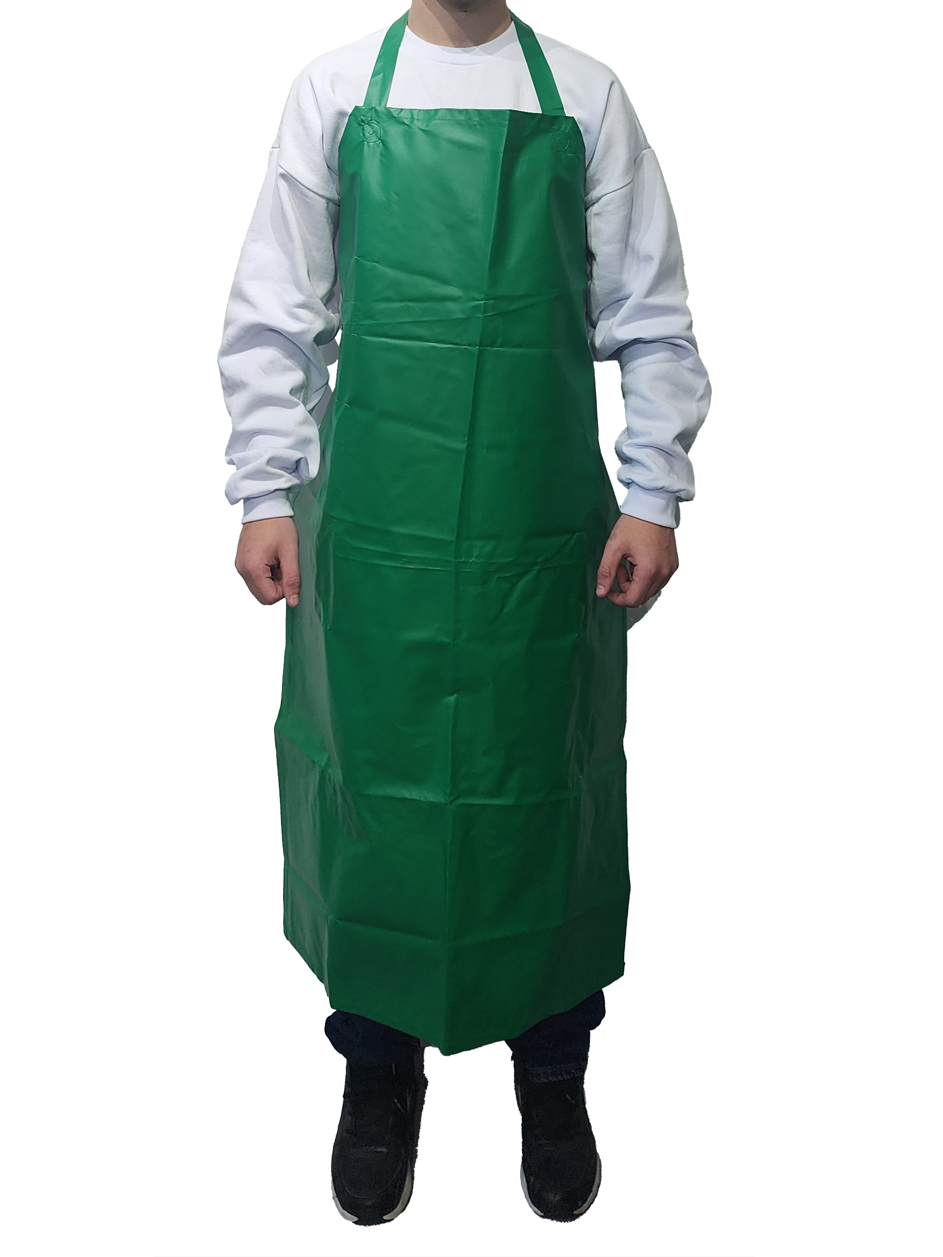 Encaixe no pescoço costurado e duas tiras de ajuste nas costas feitas com o mesmo material do avental (PVC).