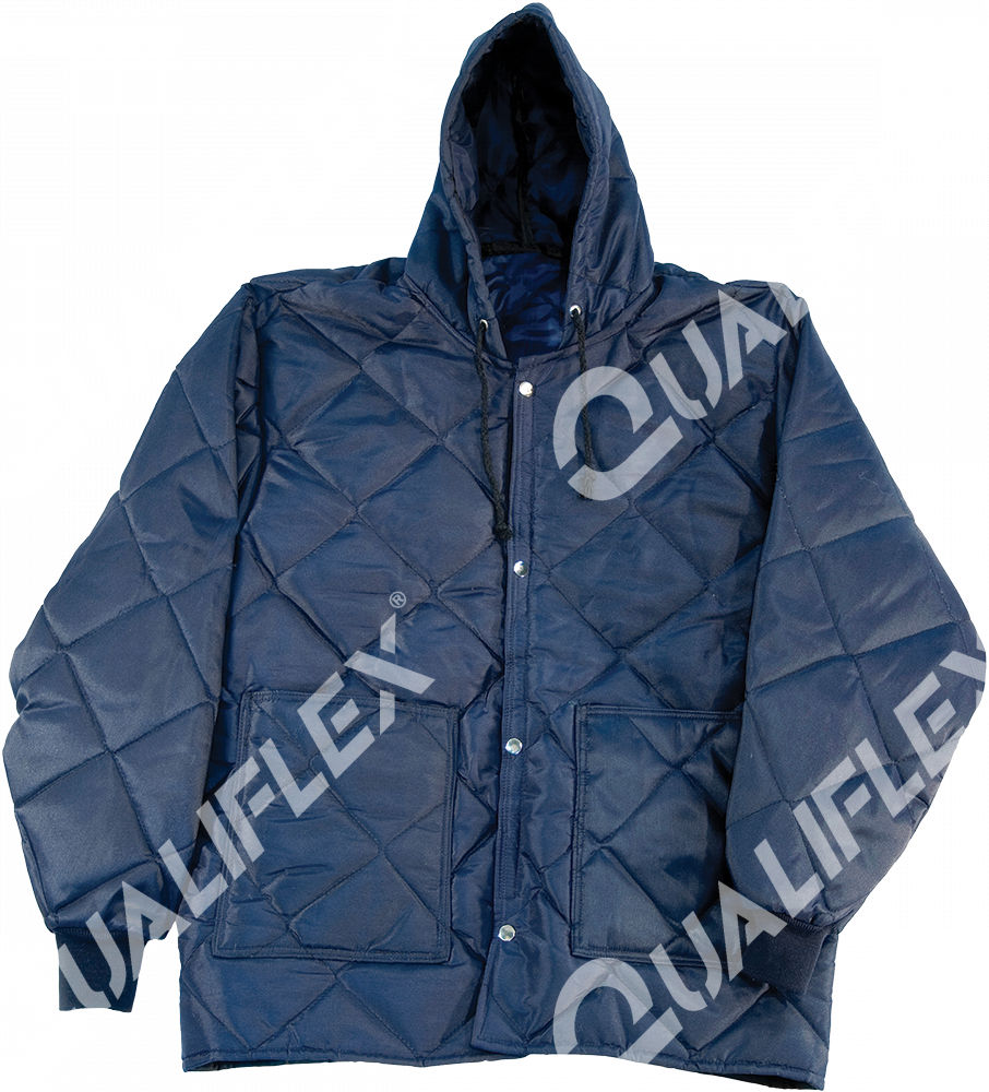 Japona térmica confeccionada em nylon resinado, manta térmica interna de poliéster de 200g/m², capuz acoplado com ajuste por cordão, bolsos frontais, acabamento interno e externo matelado (costurado) em losangos de 10cm, fechamento frontal por botões de pressão guiados por velcro.