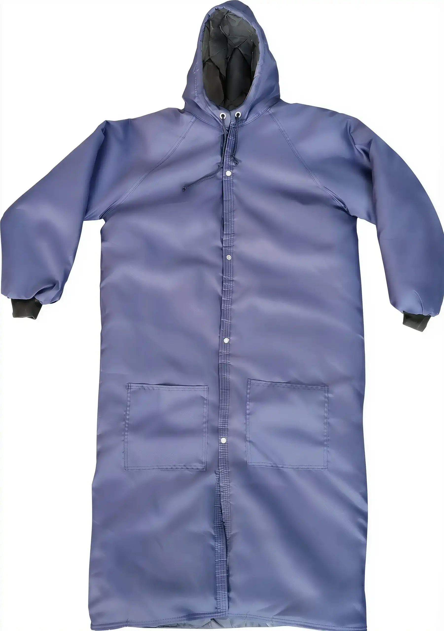 Sobretudo térmico confeccionado em nylon resinado, manta térmica interna de poliéster de 400g/m², capuz acoplado com ajuste por cordão, bolsos frontais, acabamento externo liso, acabamento interno matelado, fechamento frontal por botões de pressão de latão guiados por velcro.