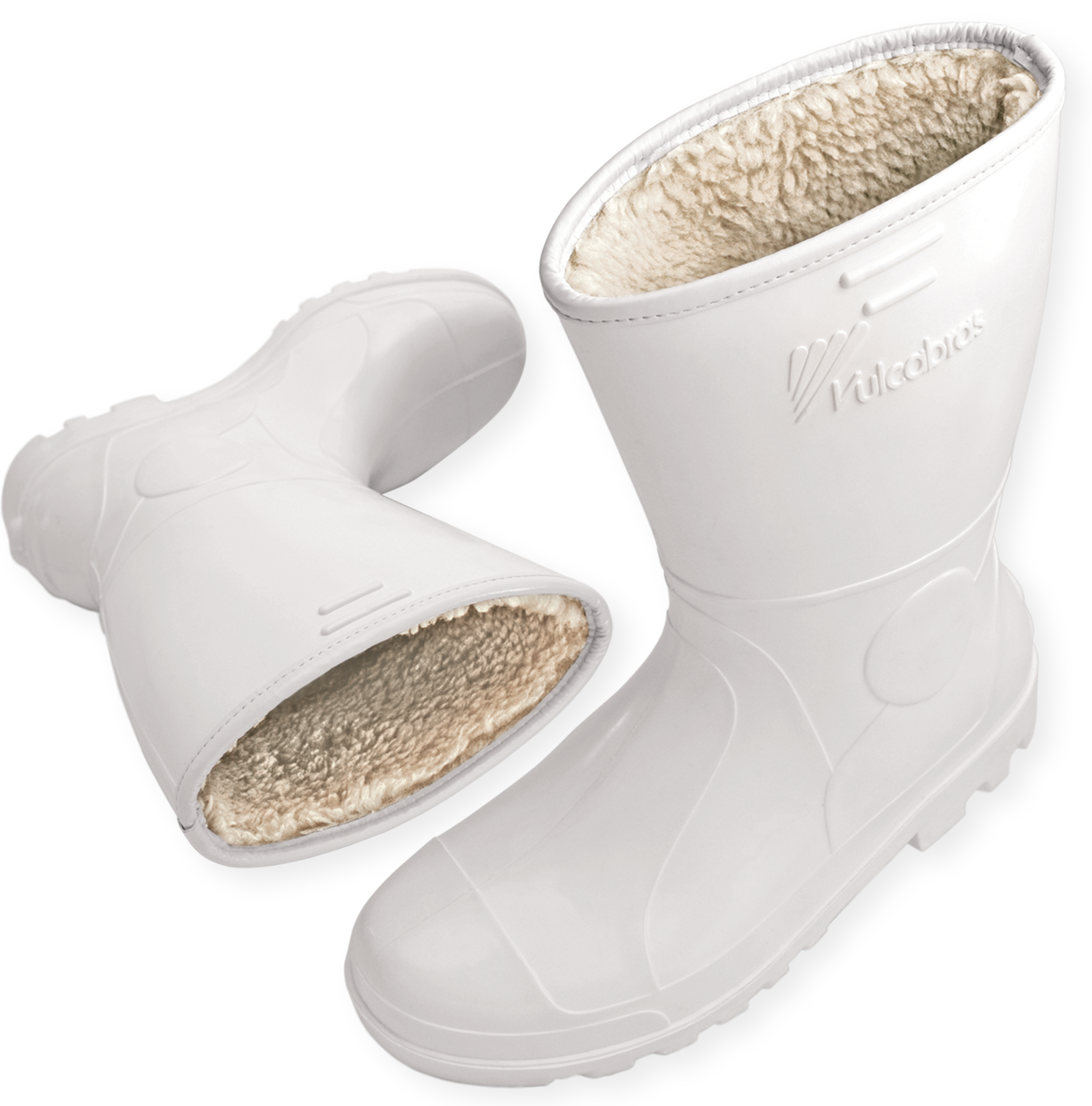 Bota fabricada em PVC injetado, cano de 24cm, solado antiderrapante de fácil higienização, forração interna de lã térmica para baixas temperaturas.